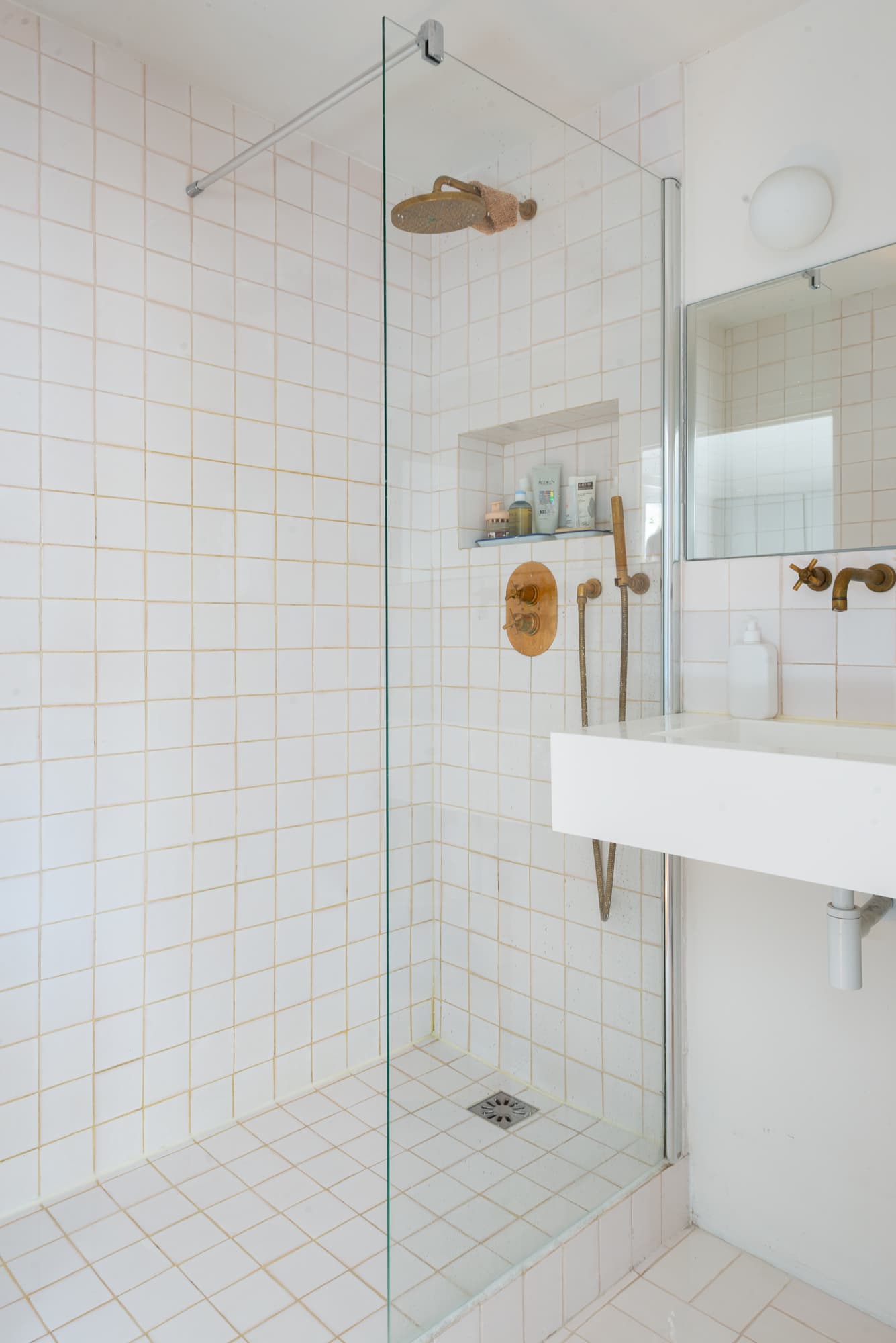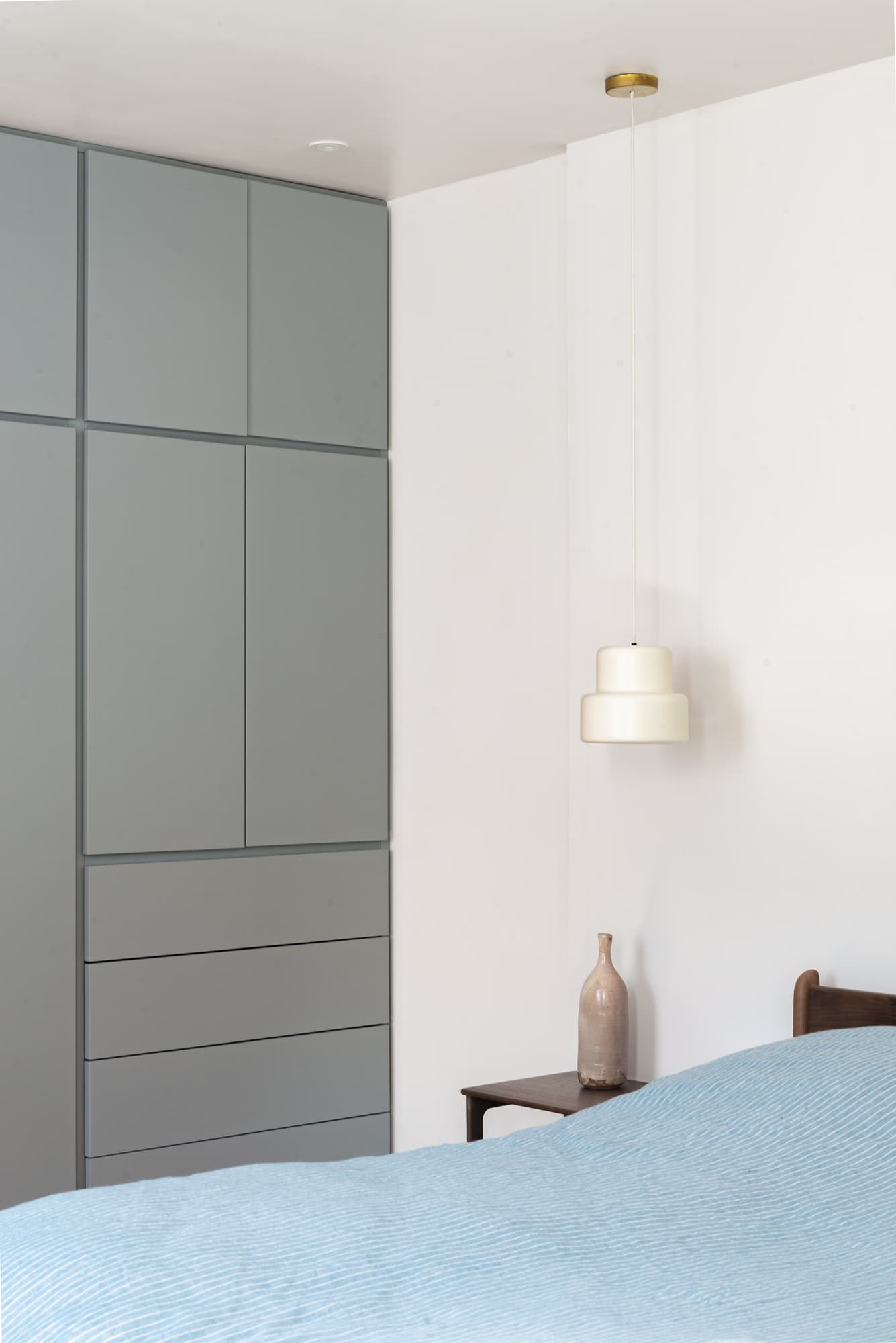 De l’autre côté du palier, une chambre parentale de 18 m² bénéficie de rangements sur mesure sur toute sa longueur. La salle d’eau, traitée en céramique dans différentes tonalités de blanc et sa robinetterie en laiton, s’inscrit dans la continuité de la chambre comme un espace calme et épuré. Pensée en suite, elle est accessible à la fois depuis la chambre et depuis le palier, offrant une circulation fluide et naturelle entre les espaces.