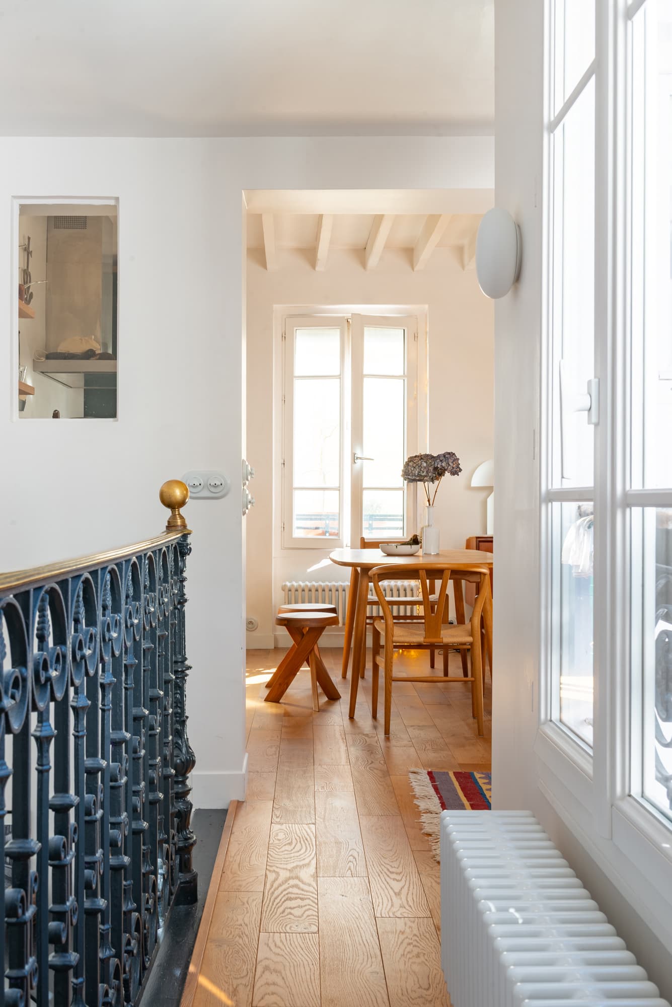 L’accès se fait par l’ancien escalier des parties communes, conservé avec sa balustrade en ferronnerie et laiton. Le palier, ouvert sur la courette, distribue l’appartement en étoile et participe immédiatement à l’atmosphère calme et préservée du lieu.