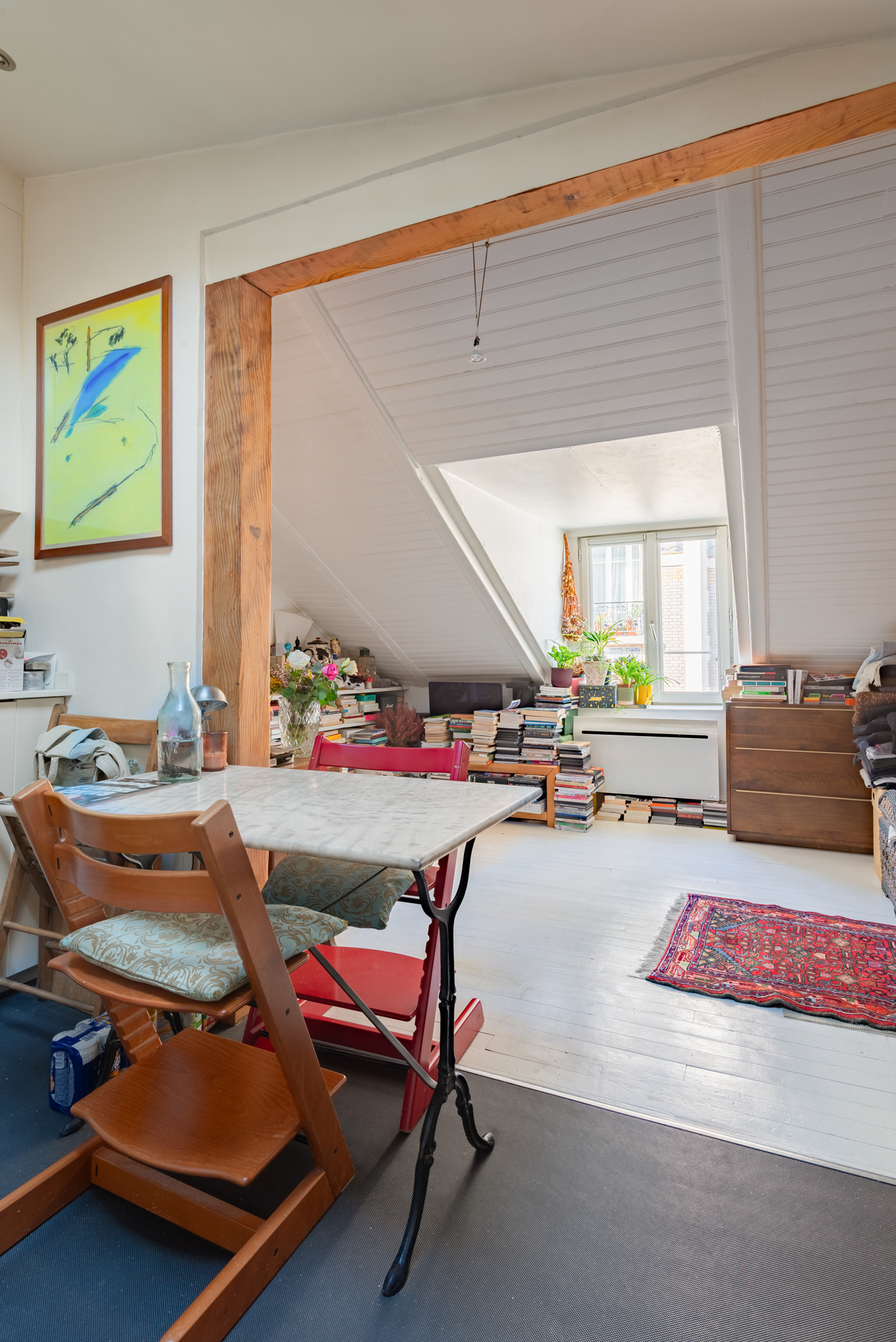 Au dernier étage de l'immeuble (4ème sans ascenseur), l'entrée se fait par une cuisine ouverte aménagée et agrémentée de nombreux rangements laissant place à son espace dinatoire indépendant naturellement éclairé par un vélux et sa lumière zénithale.