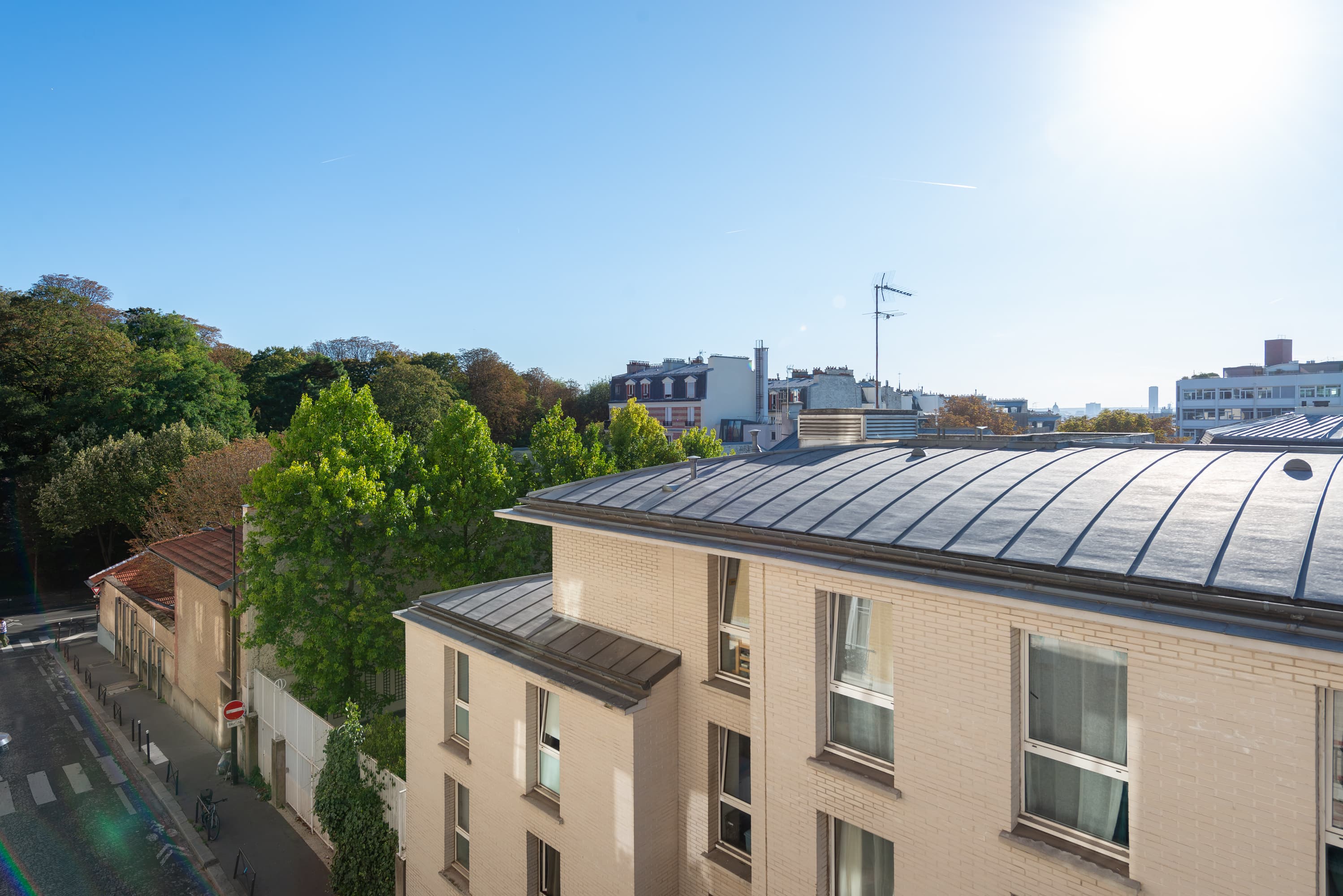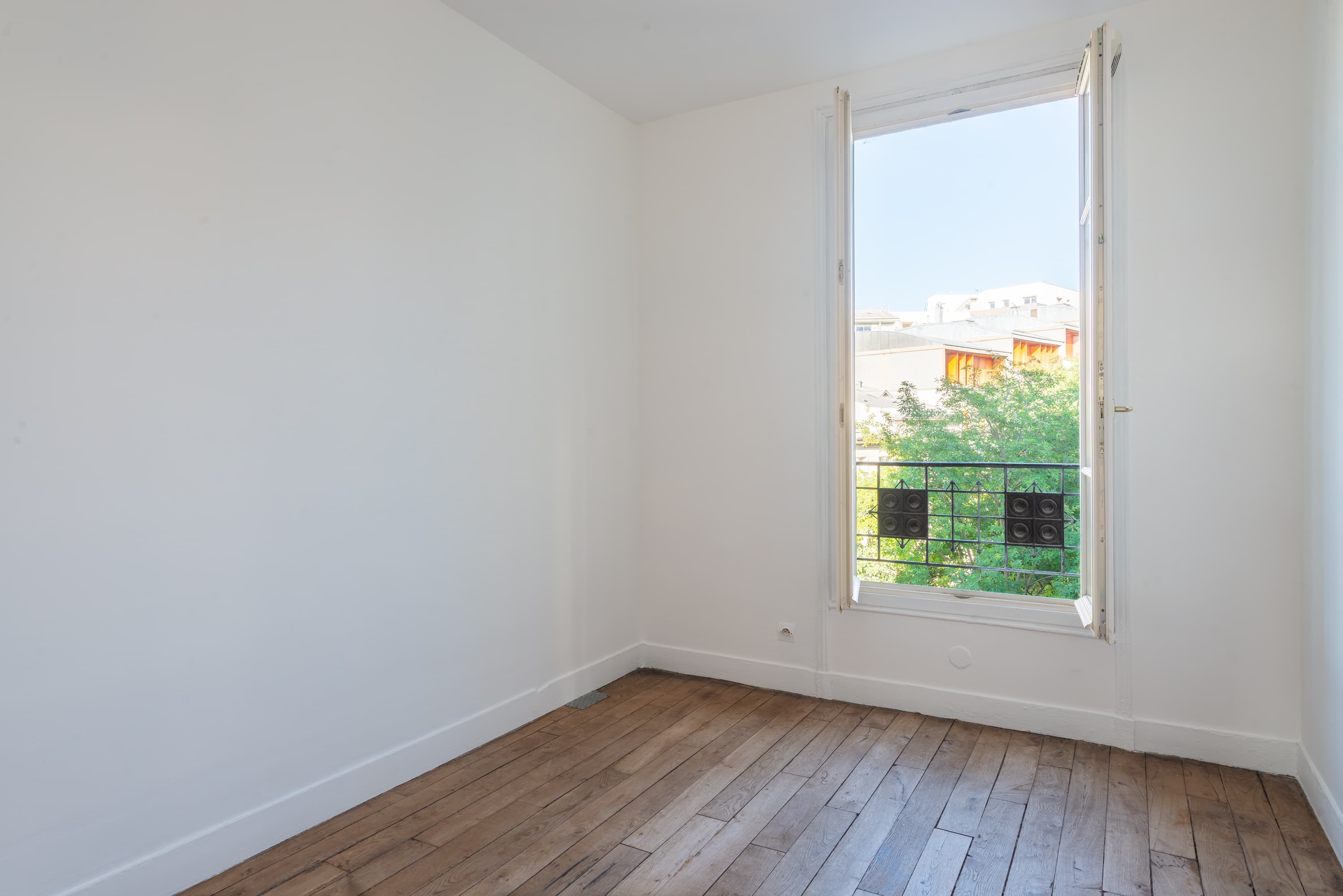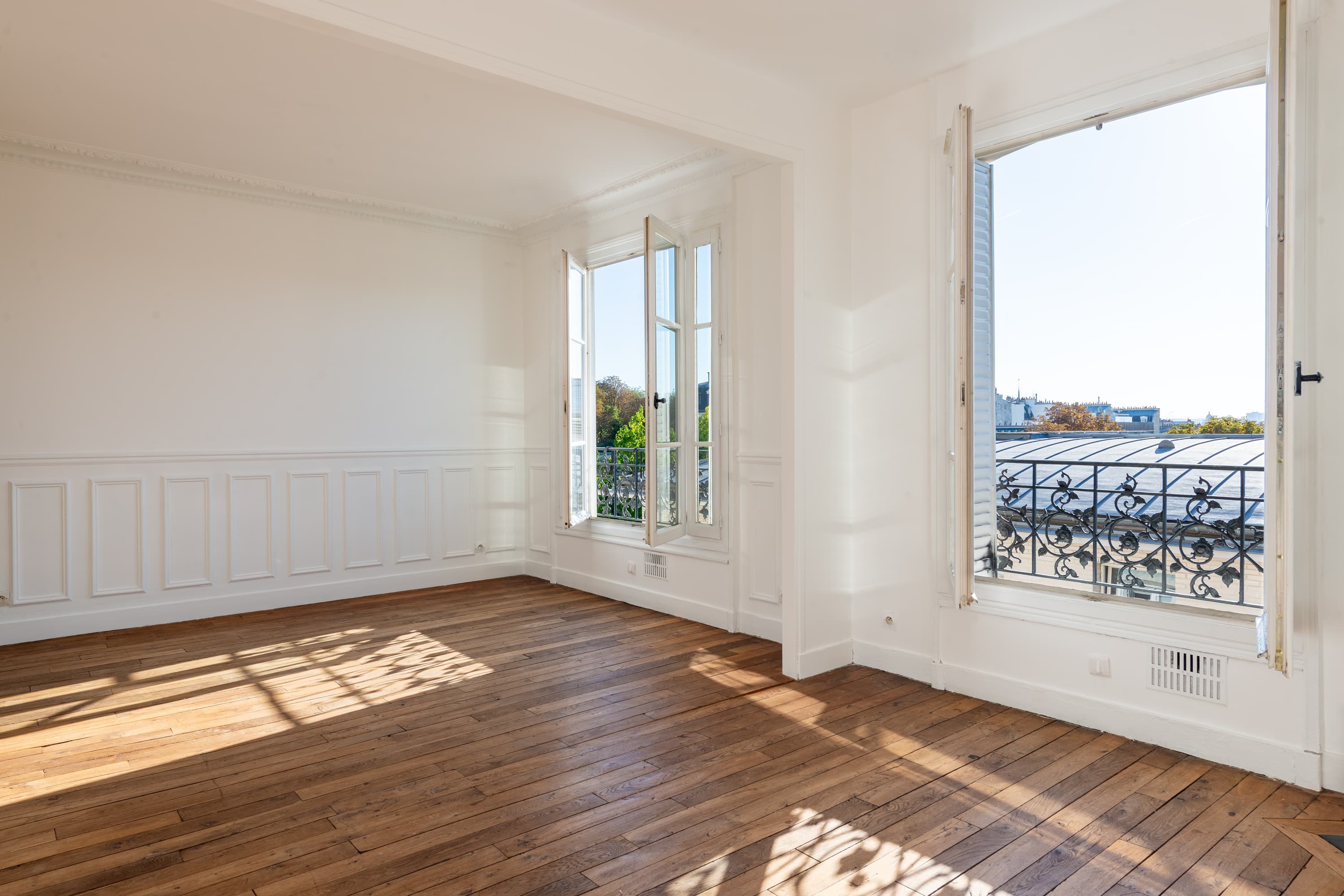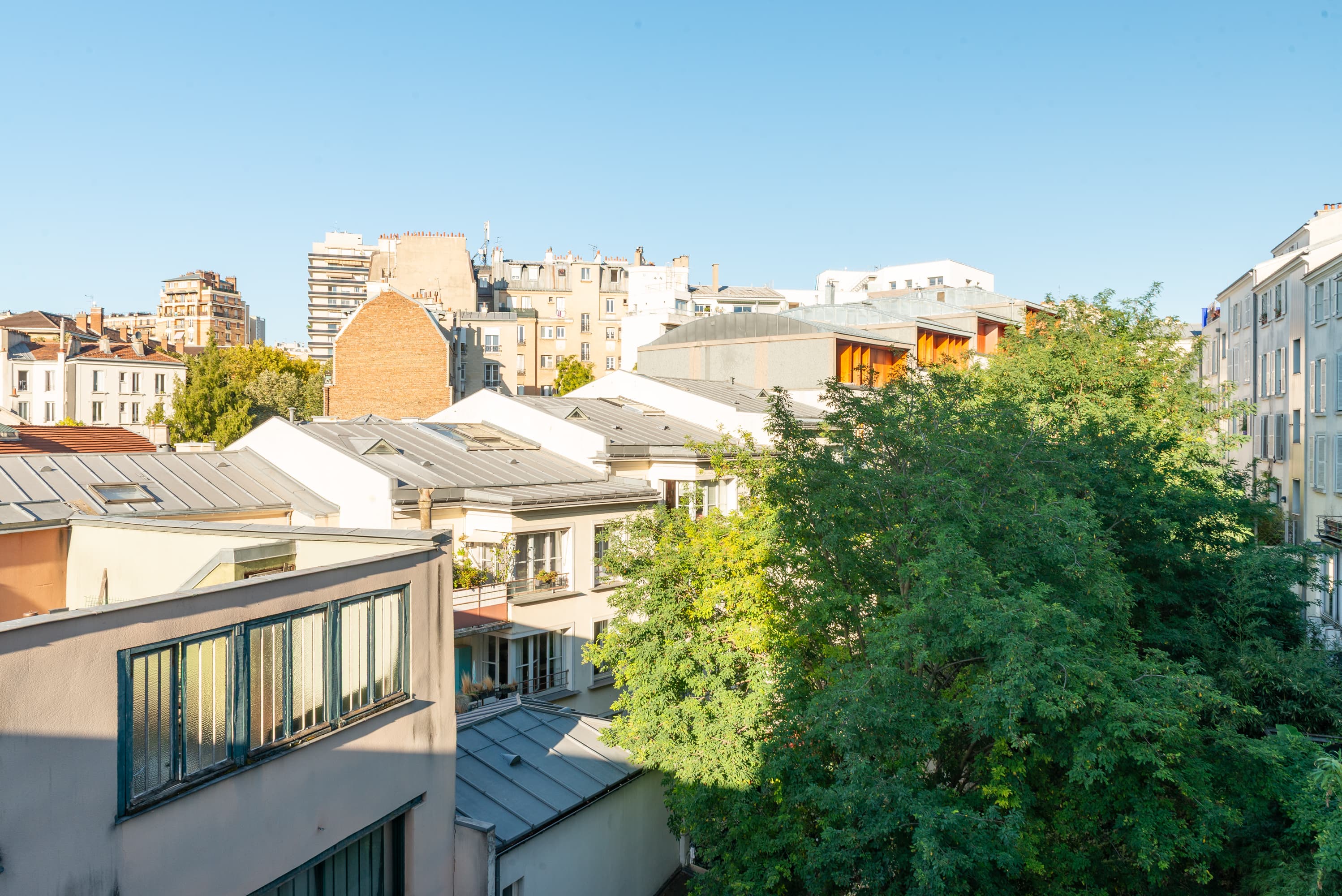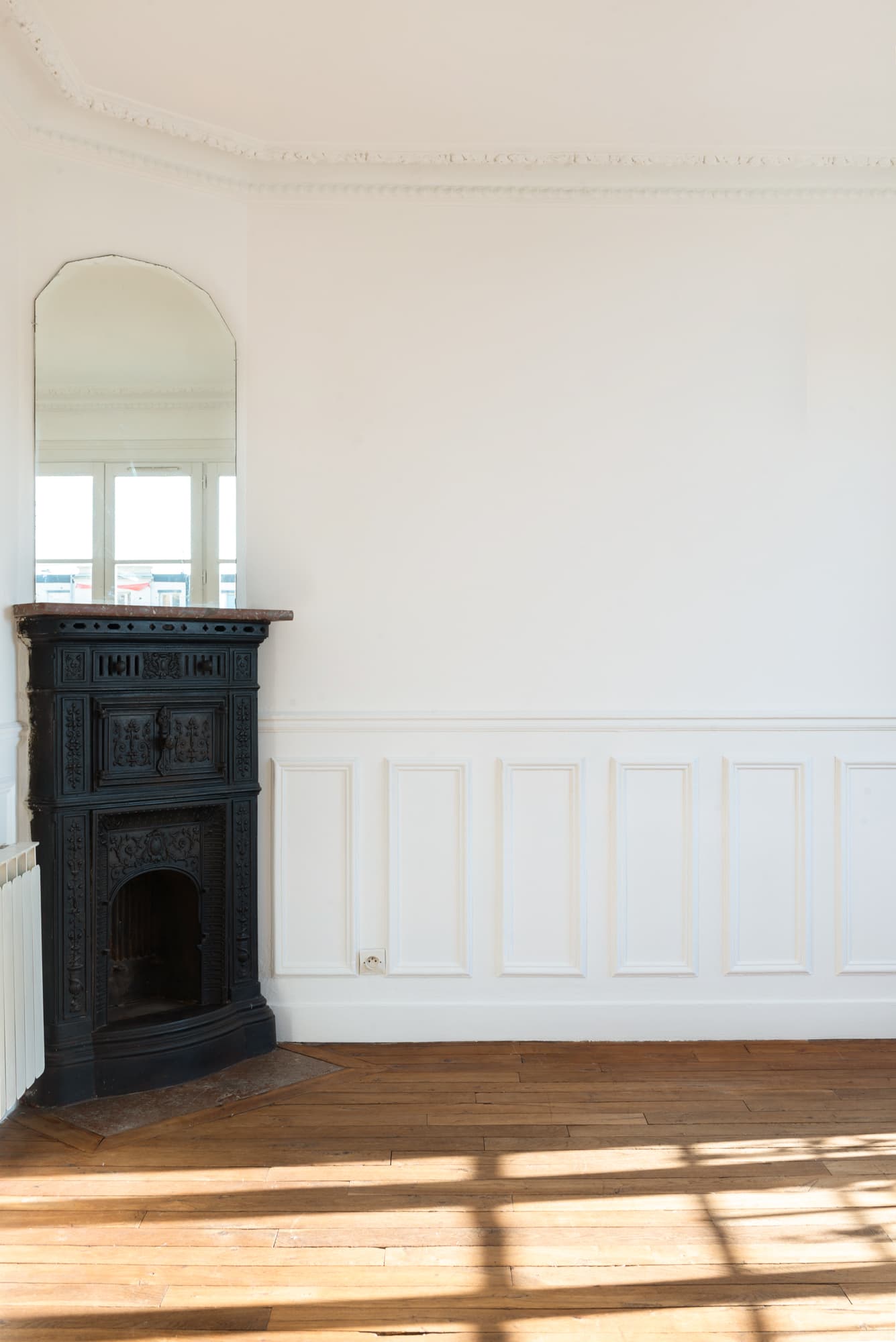 Tout d'abord sur la gauche, le séjour. Anciennement en deux pièces, il a été ouvert afin d'offrir une surface de 24m2 et une luminosité abondante par ses deux larges fenêtres, sa hauteur sous plafond de 2m65 et ses vues dégagées. Son orientation plein ouest permet en fin de journée la satisfaction, rare à Paris, des couchers de soleil. Parquet ancien, moulures et poêle prussien noir mat contribuent admirablement à cette ambiance des plus agréables.