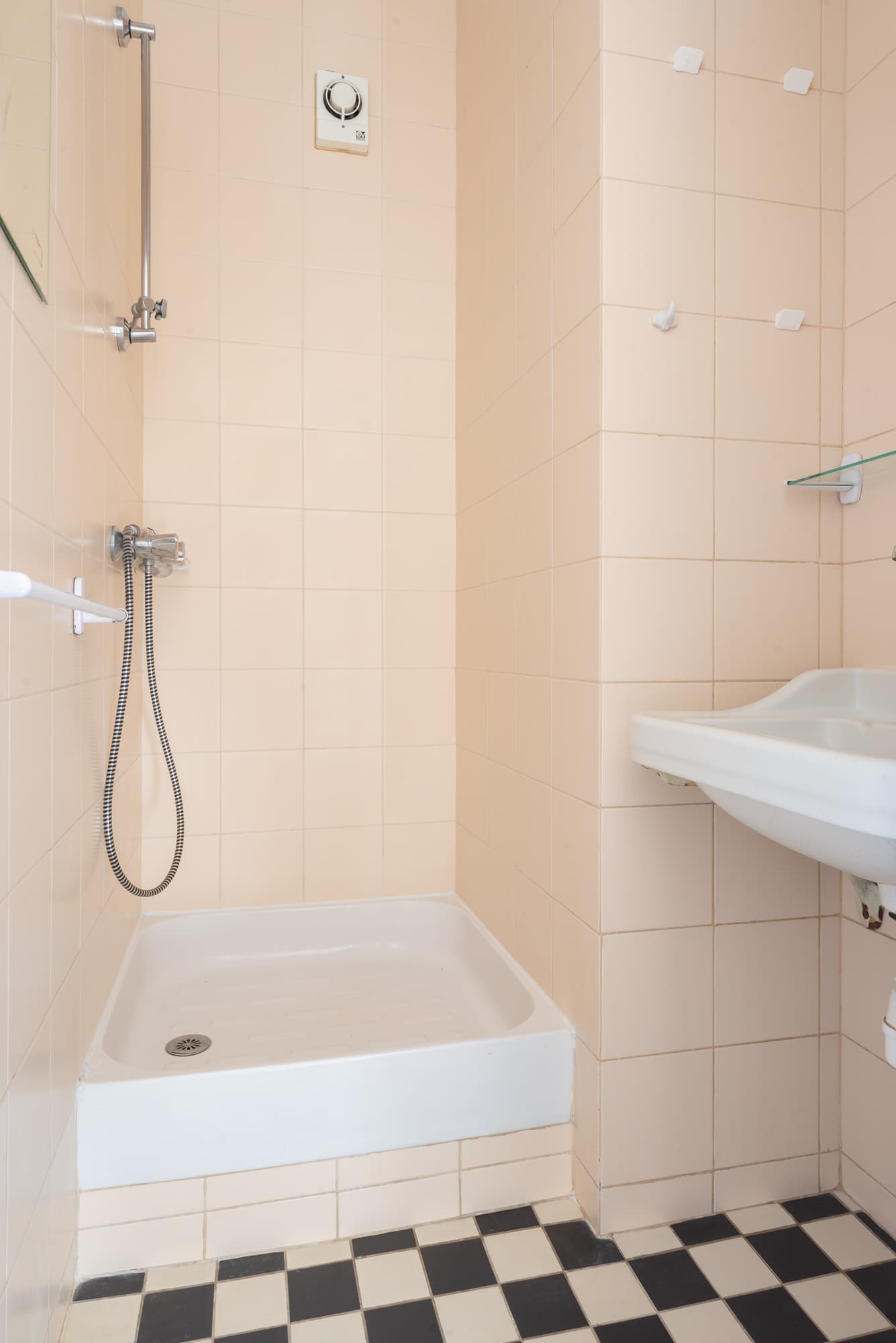 Enfin, on revient dans l'entrée qui abrite les deux dernières pièces de ce joli bien, une salle de douche fonctionnelle au sol graphique fait de carrelage noir et blanc et des toilettes séparés.