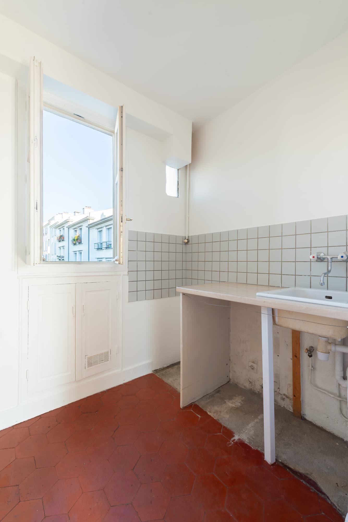 De l'autre coté, une cuisine aménagée avec son sol en tomette rouge surplombe le jardin des copropriétés avoisinantes permettant une perspective et un calme très plaisants.